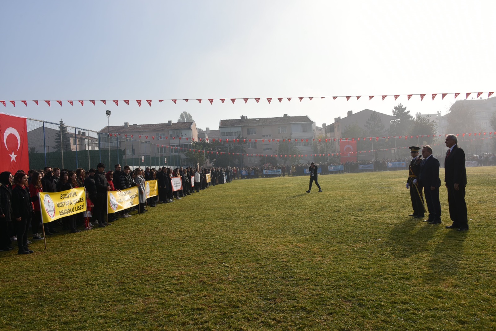 Ardından protokol üyeleri ve katılımcılar etkinliklerin yapılacağı Bozüyük Kapalı Spor Salonu yanındaki çim sahaya geçti. Çim sahada düzenlenen törene protokol üyeleri ve öğrencilerin yanı sıra vatandaşlar da yoğun ilgi gösterdi. Tören ilk olarak Kaymakam Adem Öztürk, Garnizon Komutanı Vekili Mühimmat Üsteğmen Buğrahan Köse ve Belediye Başkanı Mehmet Talat Bakkalcıoğlu'nun halkın ve öğrencilerin bayramını kutlamaları ile başladı. Saygı duruşunda bulunulması ve İstiklal Marşı’nın okunmasının ardından devam eden programda Atatürk’ün sesinden 10. Yıl Nutku dinlendi. Günün anlam ve önemini belirten konuşma İlçe Kaymakamı Adem Öztürk tarafından yapıldı.